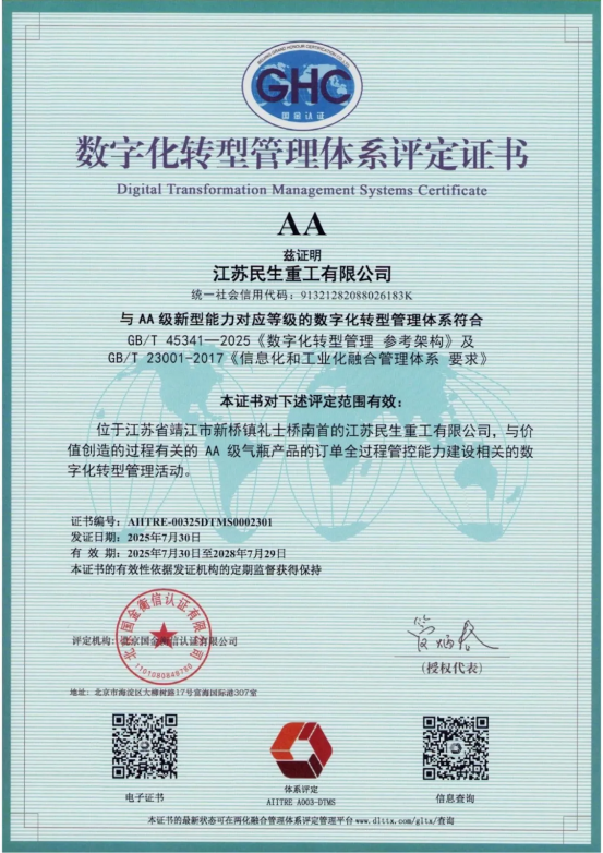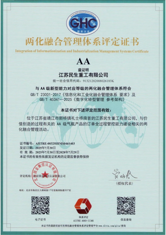 近日,江蘇民生重工有限公司(以下簡稱“民生重工”)順利通過了工業(yè)和信息化部兩化融合管理體系評定工作委員會的審核,榮獲《兩化融合管理體系A(chǔ)A級評定證書》及《數(shù)字化轉(zhuǎn)型管理體系A(chǔ)A級評定證書》。此次雙認證標志著民生重工在智能制造與信息化深度融合領(lǐng)域?qū)崿F(xiàn)里程碑式突破,為民生重工數(shù)字化轉(zhuǎn)型和管理體系的提質(zhì)增效提供了實踐范本。
